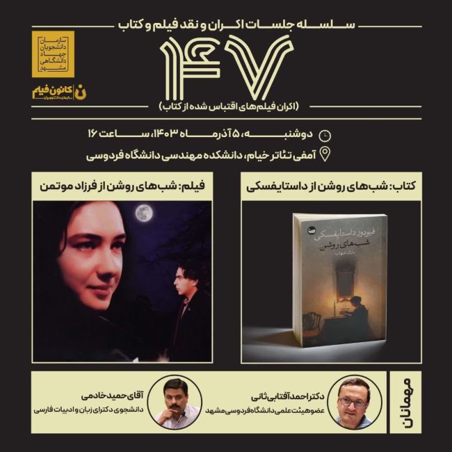 سلسله جلسات اکران و نقد فیلمهای اقتباس شده از کتاب(شبهای روشن) اخبار, خرداد-00توسط راحله رفعتینوامبر 19, 2024ارسال دیدگاهآذرماه 1403
